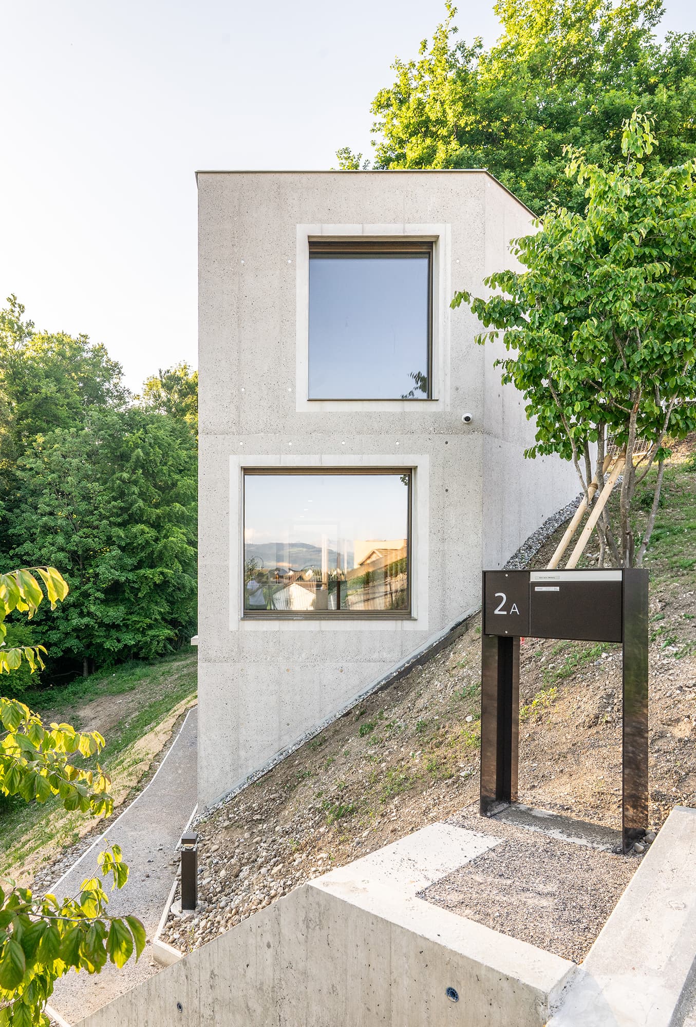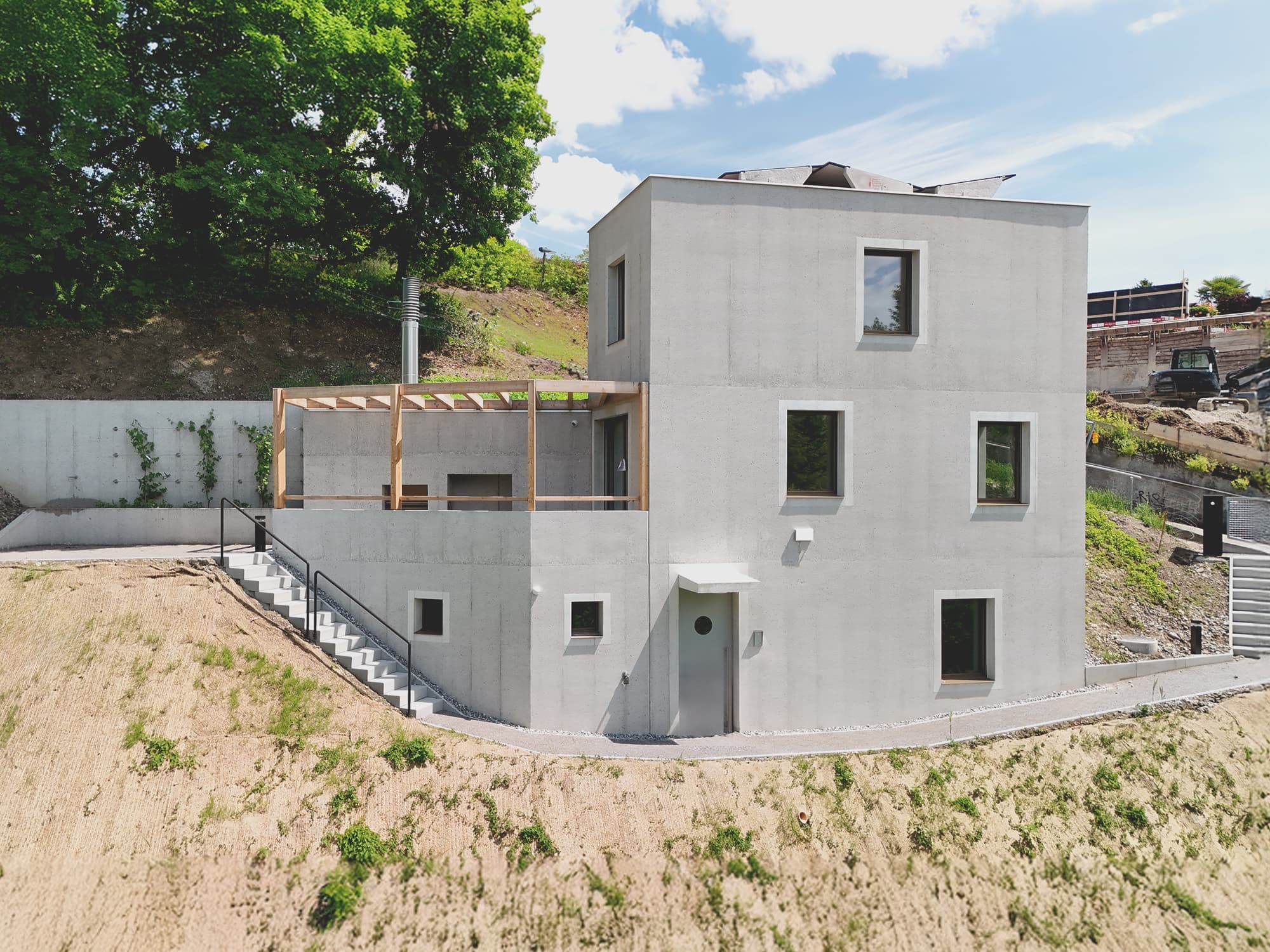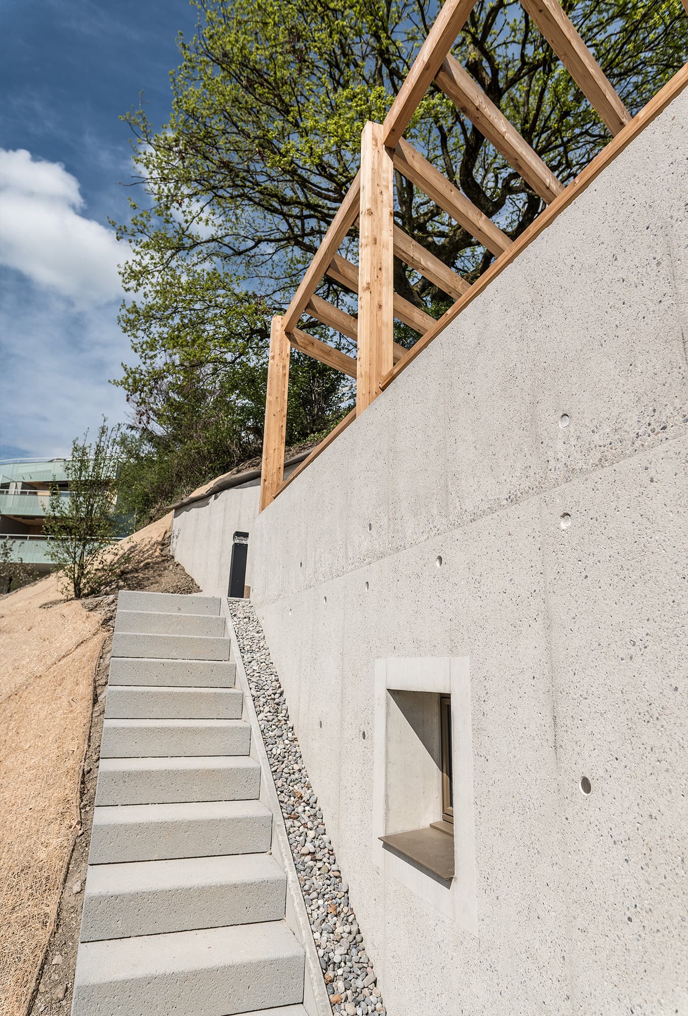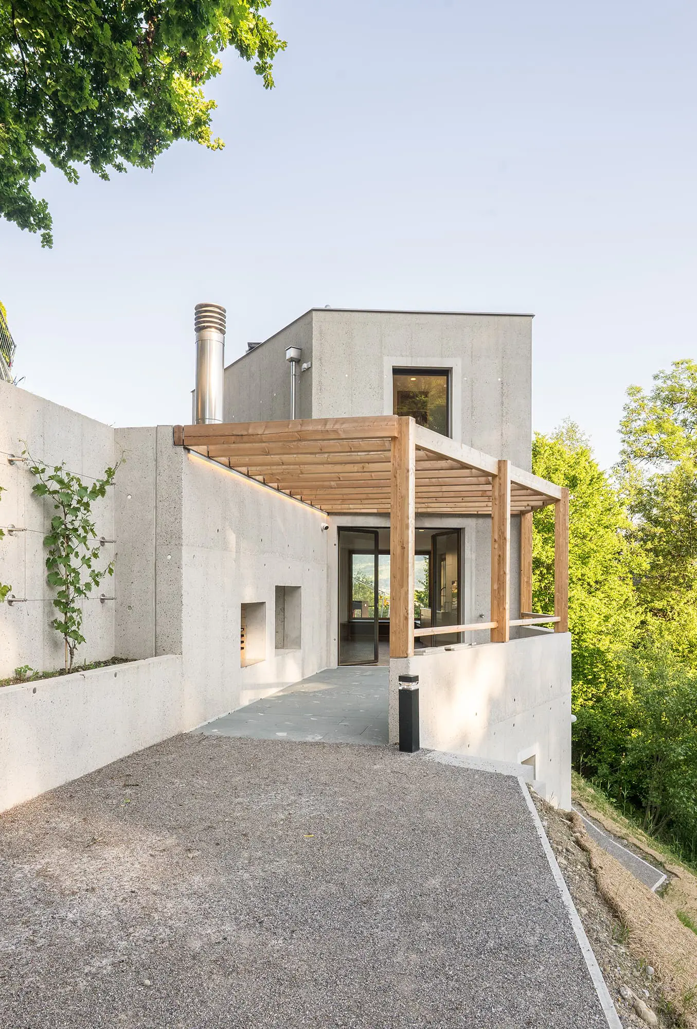 Mitten in Uerikon liegt eine Parzelle, eingebettet zwischen Rebzeilen, einem eingeschnittenen Tobel mit einem kleinen Wald und lockerer Wohnbebauung. Ein dreigeschossiges Wohnhaus besetzt den steilen Hang entlang der Höhenlinien, talwärts gestaffelt. Das Gebäude orientiert sich zum Torlenbach, der durch ein bewaldetes Tobel in die Ebene tritt, sowie in die Weite des Zürichsees. Der kompakte Baukörper basiert auf einer massiven Struktur aus Beton, die fest im Steilhang sitzt. Die Fassade besteht aus gestocktem, hell pigmentiertem Beton. Innen wird der Raum durch wenige, präzise gesetzte Materialien geprägt: Eichen-Hirnholzparkett, feinkörnig geglätteter Kalkputz, Einbauten aus Edelstahl und Massivholz. Küche und Nasszellen sind funktional organisiert, mit keramischen Belägen und Geräten in robustem Standard. Das Treppenhaus ist in geschliffenem Weissbeton ausgeführt, der Aussenraum ergänzt mit Natursteinplatten, einer Pergola aus Lärchenholz und einem kleinen Brunnen mit Quellwasser, der in eine Stützmauer integriert ist.