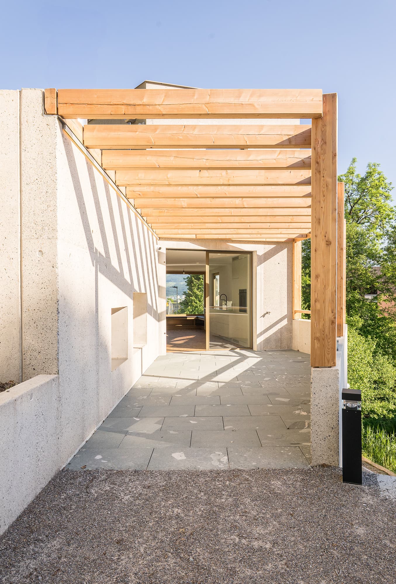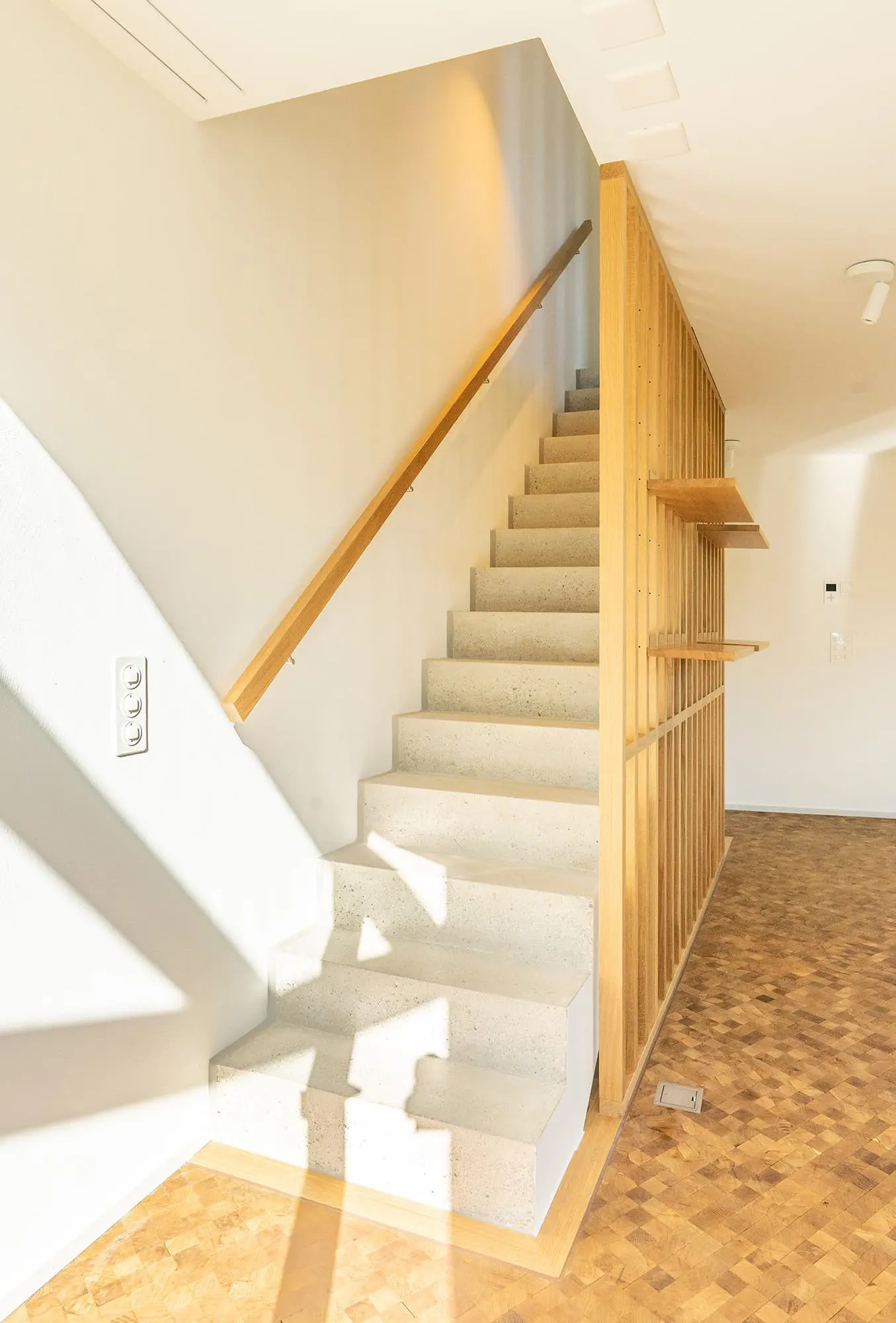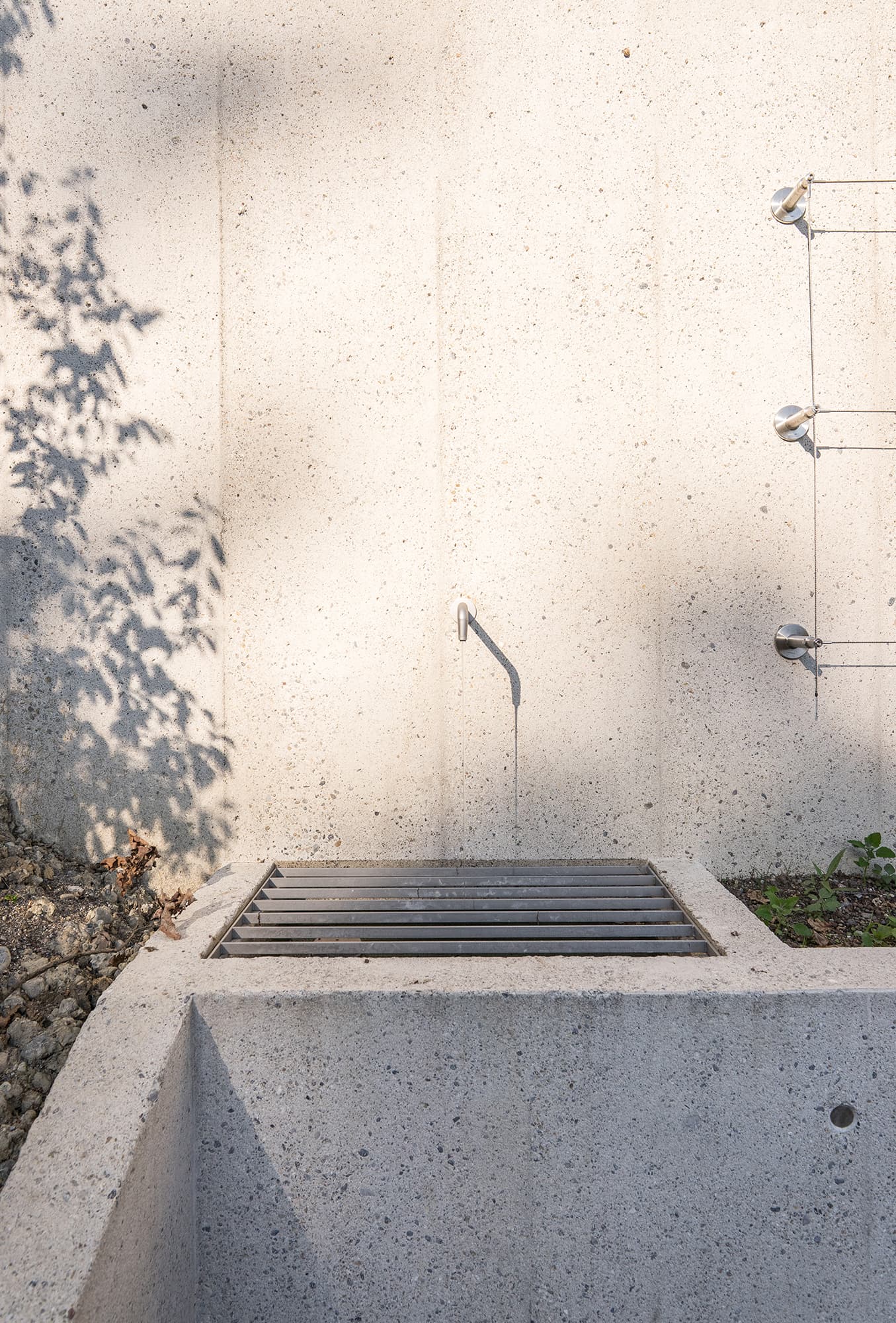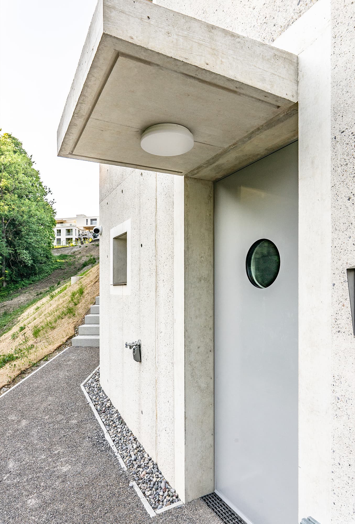 Mitten in Uerikon liegt eine Parzelle, eingebettet zwischen Rebzeilen, einem eingeschnittenen Tobel mit einem kleinen Wald und lockerer Wohnbebauung. Ein dreigeschossiges Wohnhaus besetzt den steilen Hang entlang der Höhenlinien, talwärts gestaffelt. Das Gebäude orientiert sich zum Torlenbach, der durch ein bewaldetes Tobel in die Ebene tritt, sowie in die Weite des Zürichsees. Der kompakte Baukörper basiert auf einer massiven Struktur aus Beton, die fest im Steilhang sitzt. Die Fassade besteht aus gestocktem, hell pigmentiertem Beton. Innen wird der Raum durch wenige, präzise gesetzte Materialien geprägt: Eichen-Hirnholzparkett, feinkörnig geglätteter Kalkputz, Einbauten aus Edelstahl und Massivholz. Küche und Nasszellen sind funktional organisiert, mit keramischen Belägen und Geräten in robustem Standard. Das Treppenhaus ist in geschliffenem Weissbeton ausgeführt, der Aussenraum ergänzt mit Natursteinplatten, einer Pergola aus Lärchenholz und einem kleinen Brunnen mit Quellwasser, der in eine Stützmauer integriert ist.