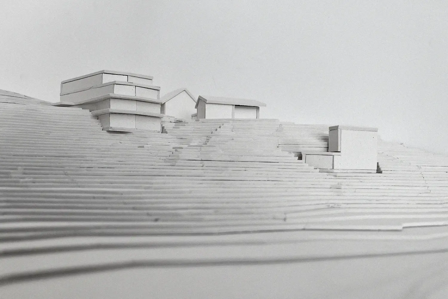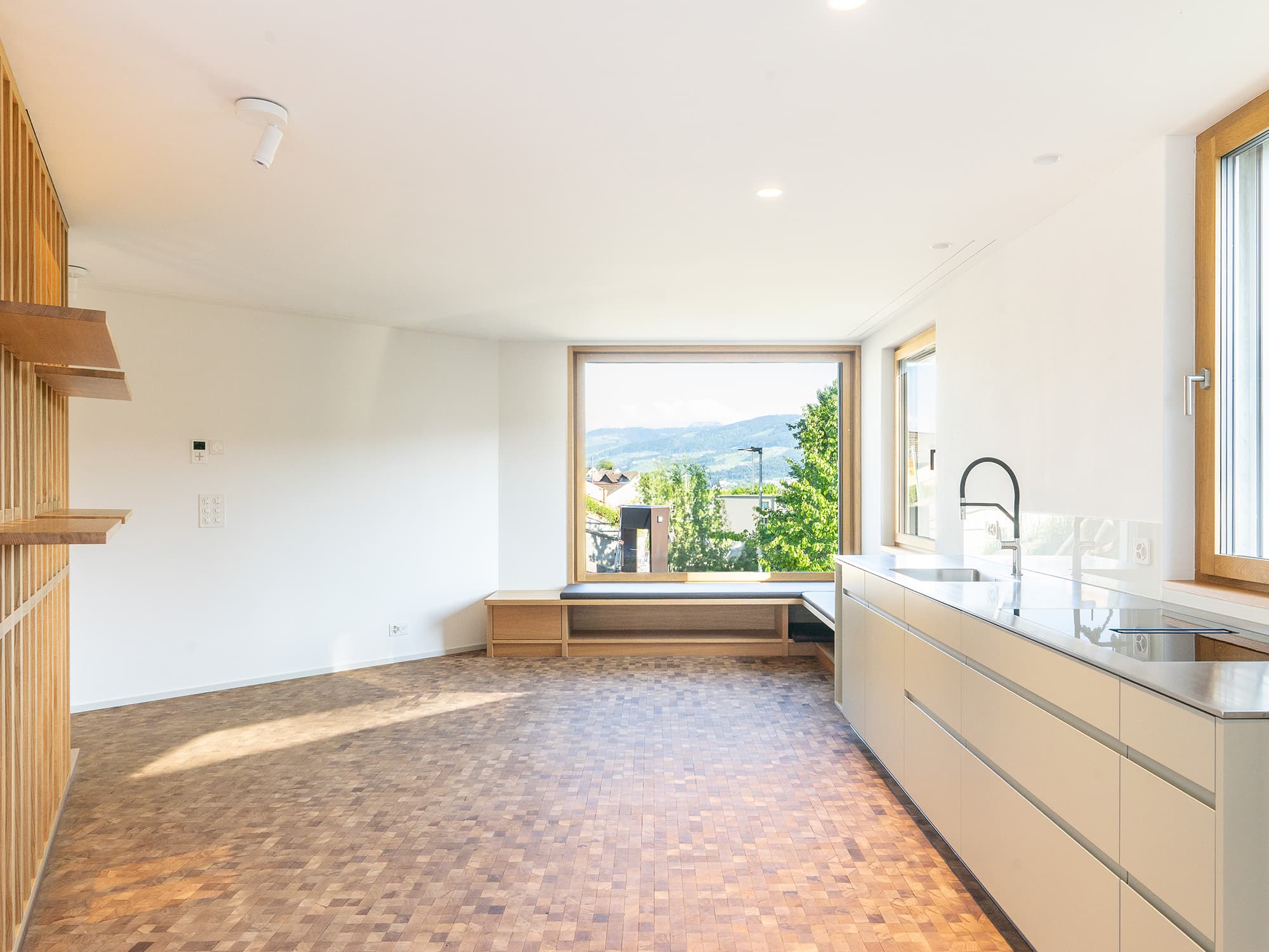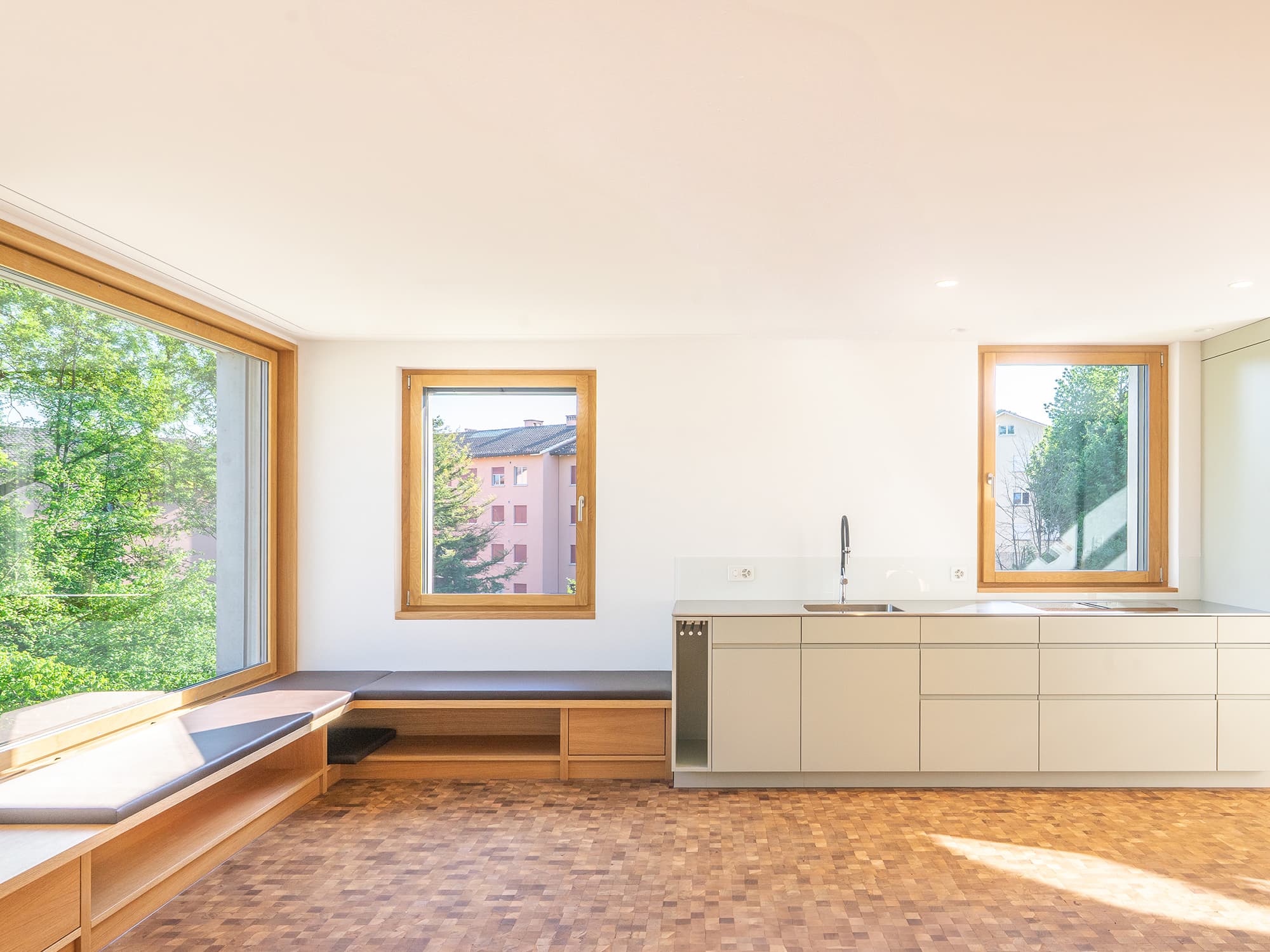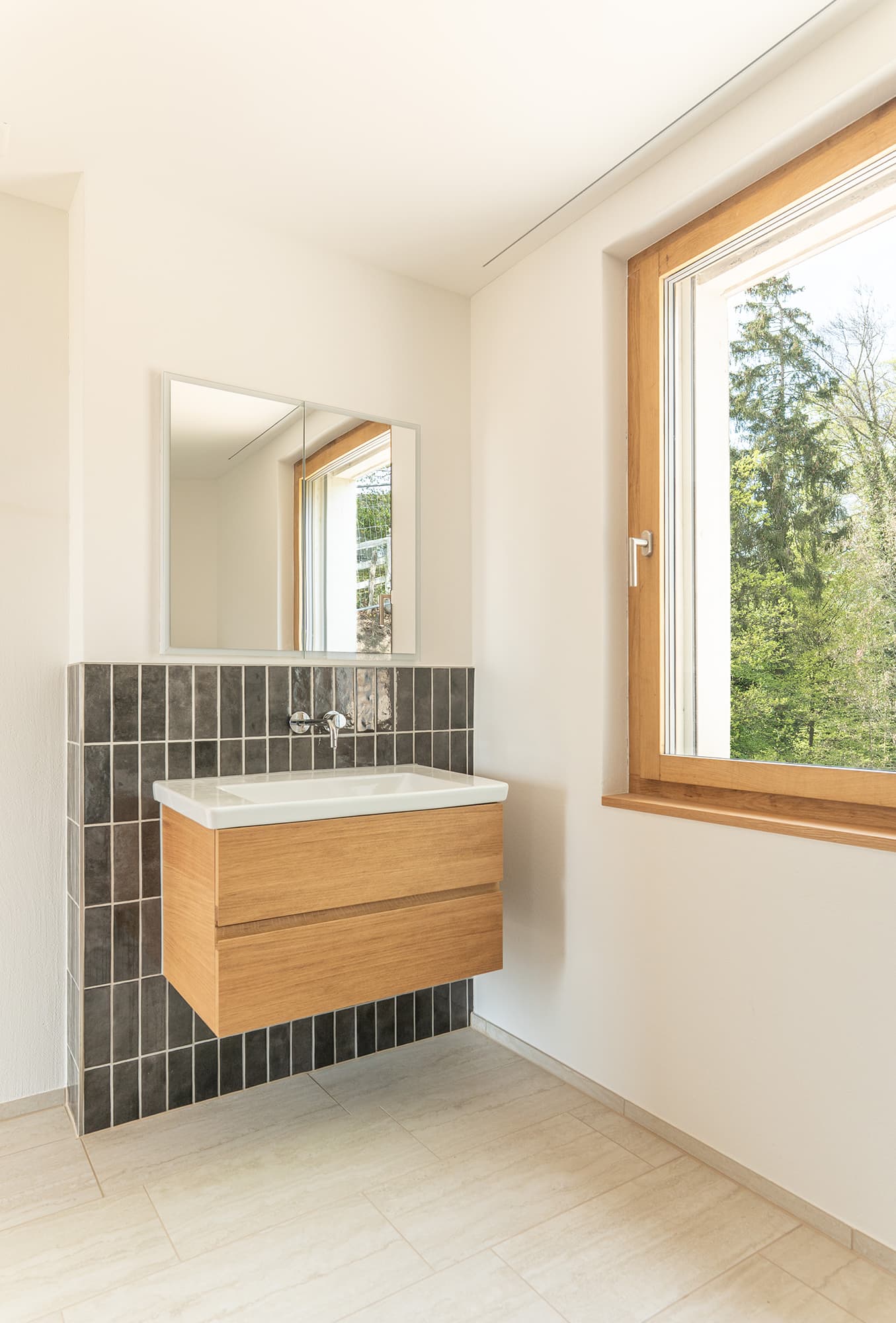 Mitten in Uerikon liegt eine Parzelle, eingebettet zwischen Rebzeilen, einem eingeschnittenen Tobel mit einem kleinen Wald und lockerer Wohnbebauung. Ein dreigeschossiges Wohnhaus besetzt den steilen Hang entlang der Höhenlinien, talwärts gestaffelt. Das Gebäude orientiert sich zum Torlenbach, der durch ein bewaldetes Tobel in die Ebene tritt, sowie in die Weite des Zürichsees. Der kompakte Baukörper basiert auf einer massiven Struktur aus Beton, die fest im Steilhang sitzt. Die Fassade besteht aus gestocktem, hell pigmentiertem Beton. Innen wird der Raum durch wenige, präzise gesetzte Materialien geprägt: Eichen-Hirnholzparkett, feinkörnig geglätteter Kalkputz, Einbauten aus Edelstahl und Massivholz. Küche und Nasszellen sind funktional organisiert, mit keramischen Belägen und Geräten in robustem Standard. Das Treppenhaus ist in geschliffenem Weissbeton ausgeführt, der Aussenraum ergänzt mit Natursteinplatten, einer Pergola aus Lärchenholz und einem kleinen Brunnen mit Quellwasser, der in eine Stützmauer integriert ist.